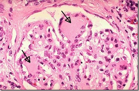 Histopathology of nodular glomerulosclerosis (Kimmelstiel-Wilson